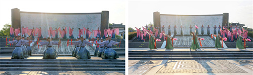 “泗水王劉靖”“婕妃”以諸侯之禮歡迎賓客,儀仗肅立、華蓋蔽日,再現興盛時期“大漢酒國”的榮耀與威儀。基地員工依諸侯禮節表演了六佾文舞,彩帶紛飛、古韻十足,展現了“仁義禮智信”的中華正統文化精髓。